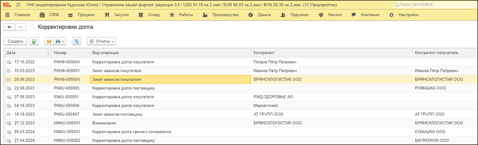 Отразить финансовые операции по взаиморасчетам с контрагентами в 1С:УНФ можно через инструмент «Корректировка долга».