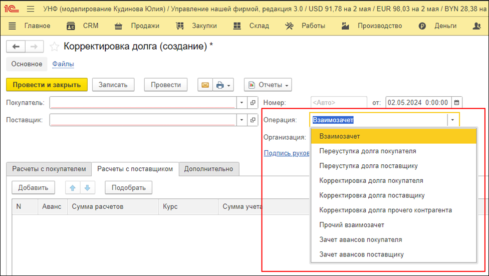 Как в 1С:УНФ провести корректировку долга | Инструкции по 1С:УНФ | Айтон: внедрение, сопровождение, 1С:УНФ