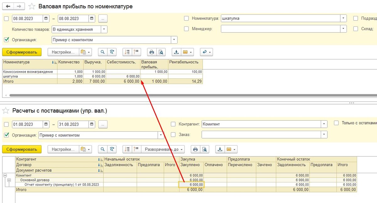 3) Сделали отчет комитенту. Указали цену 6000 рублей, цену поступления 5000 рублей и сумму комиссии 1000 рублей
